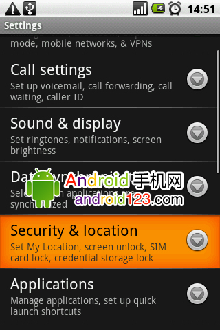 关于密码的设置当然是在Security&Location中了,所以我们先在主屏界面上按下Menu菜单键,在弹出的进阶菜单中选择最后一项“Settings”;