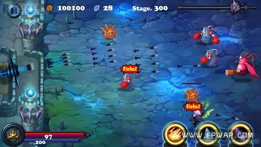 游戏进程非常之激烈,敌人血量和攻防会越来越高,玩家如果不能策略性的使用弓箭配合魔法,就会有城毁人亡之虞。右上角的进度条是敌人进攻的剩余时间,走到尽头就能顺利过当前的一关,左下角的血量和魔法槽大家应该一眼就能看出来,不过魔法的回复十分缓慢,而三个魔法的消耗十分惊人,一定要控制好时间。击败敌人会得到金钱和水晶的奖励,金钱可以用来升级弓箭的威力和范围,水晶能不断强化当前的魔法并且开发出更加强力的魔法。究极魔法的使用可谓惊天动地,攻击力和动画效果演示都十分优秀。
