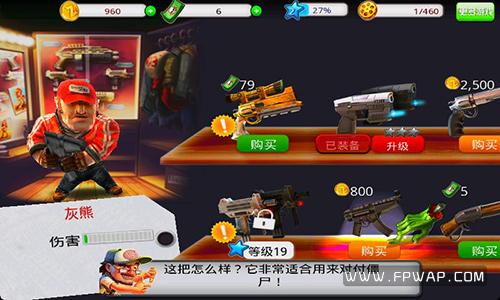 打开商城可以购买武器。《僵尸坞》设置了20种武器,只要玩家等级达到要求即可解锁。除了花钱购买高级武器外,玩家也可以选择升级现有武器,增加杀伤力。
