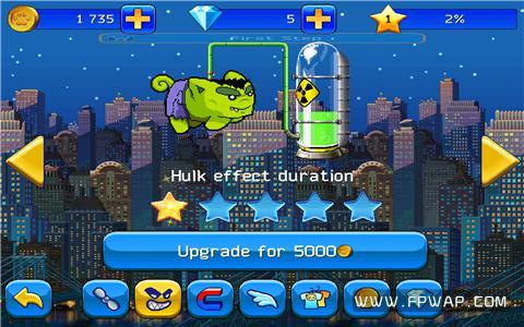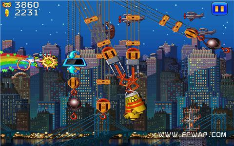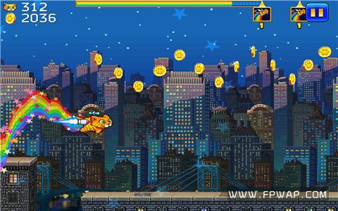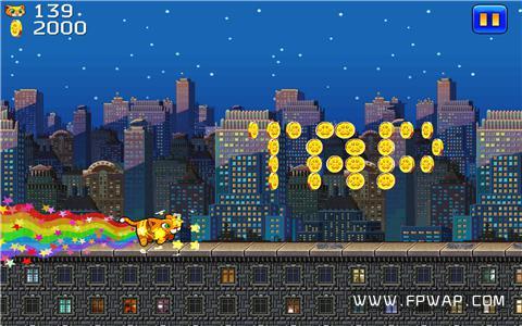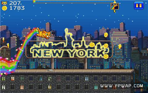 跑酷的起始城市设置在美国纽约,在初次看到超细颗粒的像素画风时确实让飞鹏小编产生了一种错觉,误认为是通用版本所造成的画面失真,后来才发现原来这是开发商刻意为之,为的是让玩家过一把怀旧瘾。游戏没有任何教程,只用点触操作即可让猫咪跃起,连续点击两次则会作出二段跳,而为了不影响游戏的整体视觉,虚拟按键和各种功能图标也是能省则省,视效确实美观大方了不少。