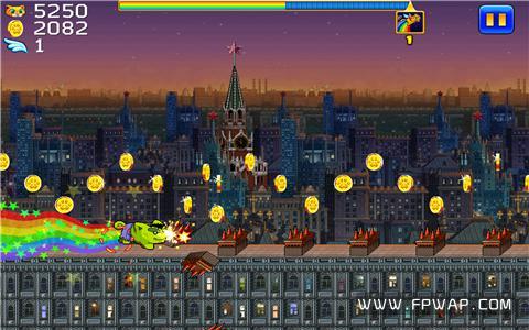 点开游戏之后,一只让人觉得颇为眼熟的猫咪赫然呈现在眼前,再加上尾巴所带出的彩虹,不用怀疑,十有八九就是加菲猫和彩虹猫(Nyan Cat)无节操地合体了,而这两个大热的猫咪明星都曾作为主角发布过跑酷游戏,如《加菲猫荒野骠骑》和《彩虹猫!》(Nyan Cat!)。看到这里,想必“抄袭”、“山寨”这类观点已经油然而生,但是撇开创意不谈,就游戏性来说却丝毫不逊于两个“前辈”。