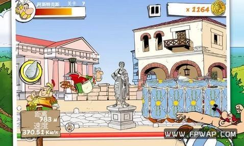 游戏有关卡和任务的设定,游戏中的任务就是要求你飞多远的距离,或者砸死多少个罗马人等等。通过飞行和砸中罗马人可以获得金币,这些金币可以用来购买商店中各式各样丰富有趣的道具。比如小鸟道具,他们可以在高卢人飞在半空中的时候托起他以飞出一段更远的距离;比如麦酒,它可以引诱敌人,增加地面上敌人的数量;再比如墨丘利凉鞋,可以减轻地球引力的作用,让高卢人飞的更远。还有让高卢人变大变小的,还有保护头盔等等。