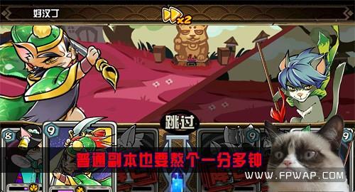 如果这样的战斗时长放在页游中完全没问题,因为你可以离开网页去干别的事。但是喵将传是个手机游戏,玩家在空闲时间用移动设备玩游戏,不会坐在那里干等你1分钟结束战斗的。况且你的战斗也没什么可关注的,为什么要用这么突破底线的战斗时长来使人烦恼呢?难道今后会推行点卡收费制?