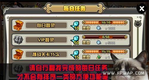 每日任务有很多,听起来很不错,但是当你完成任务后却找不到领奖宝箱时,这些众多的每日任务就成了一个麻烦,游戏并没有自动排序一类的功能,你需要在大量的任务中找到你已经完成的任务,然后一个个点开。更加令人想不到的是,点击活跃度后边的小鱼才是领取活跃度奖励,这些在游戏最初期就会遇到的东西并没有出现在教程中。
