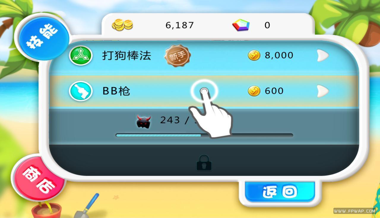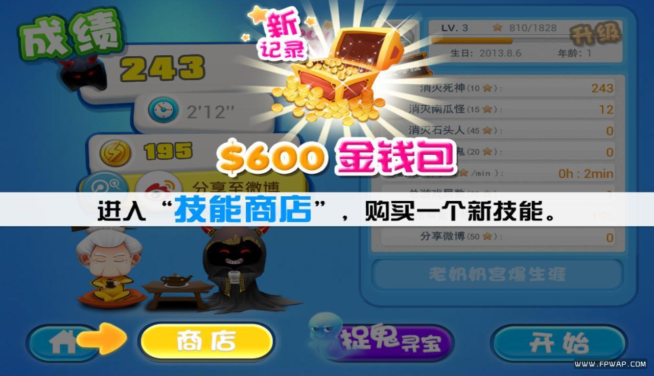 《宫保老奶奶》的操作手感还是同前作一样,舒服流畅。另外,小编还发现季节版里的游戏一个神级的技能,就是下图“BB枪”,小编亲测,这个BB枪对一般的小鬼都是一枪一个了,而且平均是30ms一发的子弹,玩家只要可以掌握好发射的节奏,基本可以靠这个过完前面的大部分关卡。