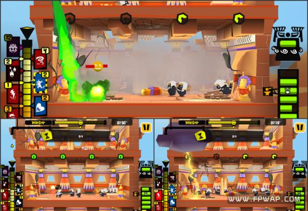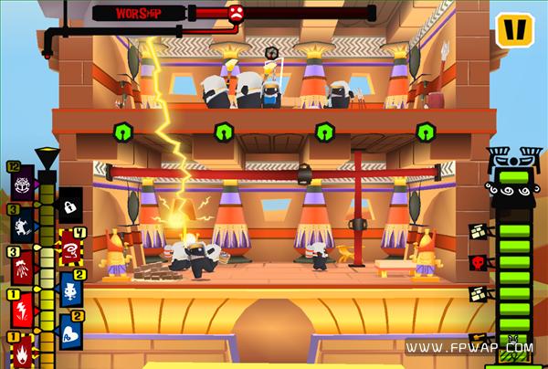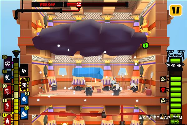 这扭动的身姿,是何等的喜感。当出现这幅画面的时候,那恭喜你,你将会和这个可爱的黑人共度余生了。人类终于到达了天界,可是迎接他们的可能是更加残酷的折磨。也不是每次输了都会这样,游戏玩到一定程度会解锁新的挑战模式,限时拆掉多少层楼这样。除了解锁模式,还会解锁天神(什么二郎神、风神、雷神),每个天神的法术都差不多,但是需要的power限制不同。法术也分两种,另一种是边框带条纹的,攻击力会更强劲。