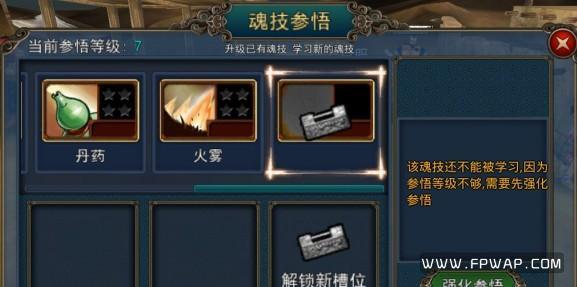 魂技:随着参悟等级的提升,你将会学到更多强力的魂技。每个魂技都可以通过参悟,提升技能等级。参悟等级不够,将无法解锁新魂技,这时你就需要通过强化参悟,吞噬魂魄来进行升级了。