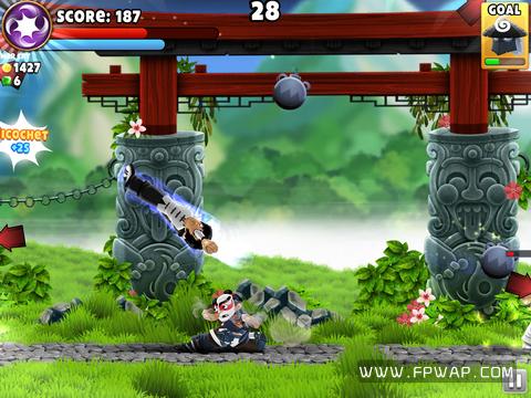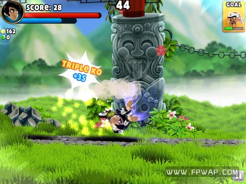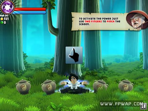 游戏操作基本可以用小儿科来形容,一开始会自动进入“教学关”,在老师傅指点下熟悉操作。其实全程只需要点击屏幕就好了,不管你怎么点,主角都会凭借他超于常人的身形做出各种高难度动作,另外可以划线进行跳跃,双指拉开可以在洗满能量的时候发动大招。游戏中的敌人也会对主角进行攻击,不过攻击前会出现一条红色虚线,玩家要及时避开。