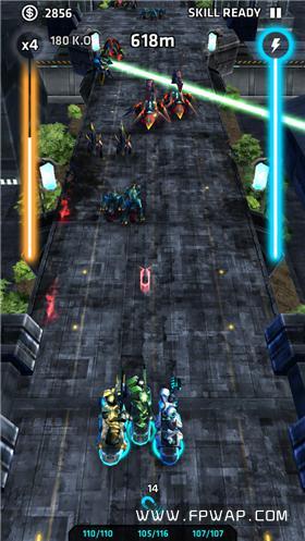 这里没有关卡一说,反倒是将跑酷要素揉合了进来,因此场景的切换只能够以移动距离的多少作为条件。经过试玩之后发现,小队每跑出 1000 米便会进入一个新的场景,而怪物的种类、攻防能力都会随之提升,弹幕也更加密集。玩家不仅需要灵活地进行躲避,而且还要留心观察画面右方的能量槽,蓄满之后可以双击屏幕发动特殊技能,比如大激光、轰炸机、护盾、能量炮等等,至于是什么类型会根据队长的职业而定。