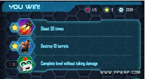 《机器人冲刺》非常有特色的就是打分系统,玩家在出发前就会有系统提示例如跳跃多少次能得到一颗星、射击多少次能得到一颗星、保持满血能得到一颗星等很多种随机的得分方式,相比于传统模糊的打分方式,这样清晰明了的告诉玩家获得分数的方法,无疑会刺激玩家在游戏中为了得分而更认真的去通关。