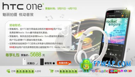 HTC One X行货预购已正式开放,预售需支付500元订金。根据HTC官方商城的数据显示,不到15分钟已有超过300名消费者成功预订,而前300位成功预定者可获得尊享大礼包(HTC One X+Beats SOLO耳机)。另外4月17日前成功购买者还有机会抽中Media Link HD,500个名额。
