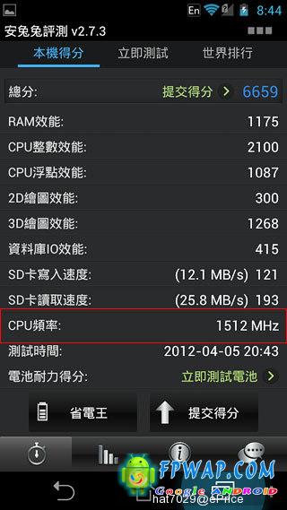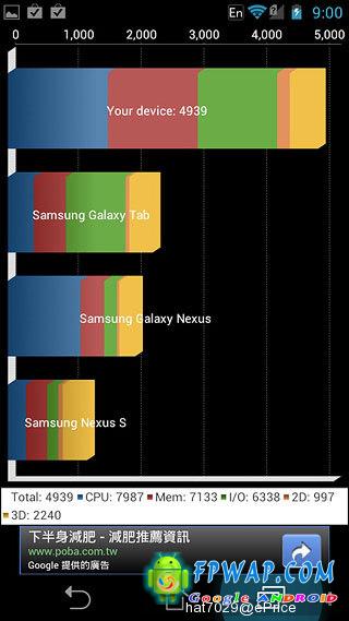 Quadrant 分数甚至比四核心手机 HTC One X 高,但 CPU 的分数就只有 7987,明显比四核机低,但有比普通 Cortex A9 手机高。