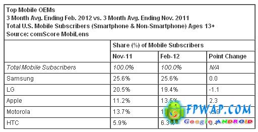 根据资料显示,截至今年2月份的三个月的平均数计算,三星名列首位,拥有 25.6% 的市场佔有率,而第二位是 LG,拥有 25.6% 市埸佔有率,其次第三位是 Apple,拥有 20.5%的市场佔有率,另外则是 Motorola 和 HTC ,根据资料显示,Apple 上升了 2.3个百份点,而 LG 跟 Motorola 则下跌 1 个百份点。