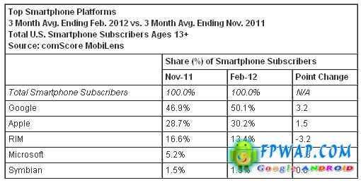 根据上图资料显示, Google Android 的系统在美国市场佔有了过 50% 佔有率,大幅抛离对手 Apple 的 30.2% 佔有率,而第三位是 Blackberry 的 RIM 有 13.4%的佔有率,其次是 Microsoft 跟 Symbian 不过 10% 的市埸佔有率,可见 Google Android 系统在美国市埸上佔有一哥的地位,小编认为 Google Android 在未来日子有上升的趋势。