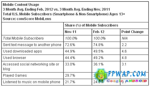 根据以上图片资料显示,在美国木土利用手机传发短信为 74.8%,较去年增加了 2.2 个百份点,另外有 49.5 的用家下载有关应用程式,增长率为第二高,拥有 4.6 个百份点,其次就是有 49.2% 用家使用浏览器,较去年增长 4.8 个百份点,另外有 36.1% 用家访问社交网络,上升了 3.1 个百份点,其次是玩手机游戏和听音乐,分别是 32.3% 和 24.8%。