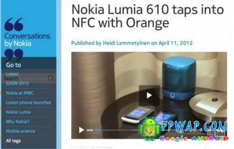 在MWC2012上,诺基亚发布入门级的Windows Phone手机Lumia610,近日该机迎来增加NFC近场通信的升级版Lumia610NFC,可与兼容配件实现快速连接、查看NFC信息等应用。Lumia610NFC将继承低价优势,配800MHz高通骁龙处理器,有256MB RAM和8GB存储空间,搭载Tango系统.