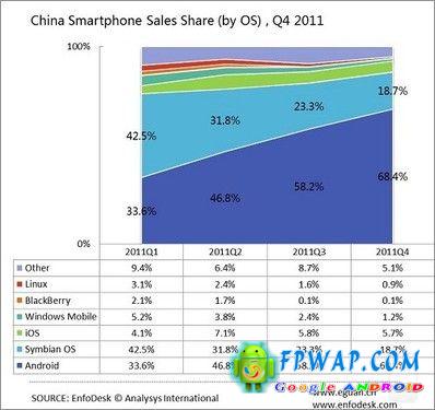 尽管iPhone在中国的普及程度看似蛮高,但易观国际近期的一份调查数据显示,过去一年iPhone手机在中国的出货量仅占智能机的6%左右。而截止到2011年第四季度,Android在中国智能机中的出货量占比达到68.4%。众多品牌加入Android生态圈及千元安卓智能机的井喷让Android称王.