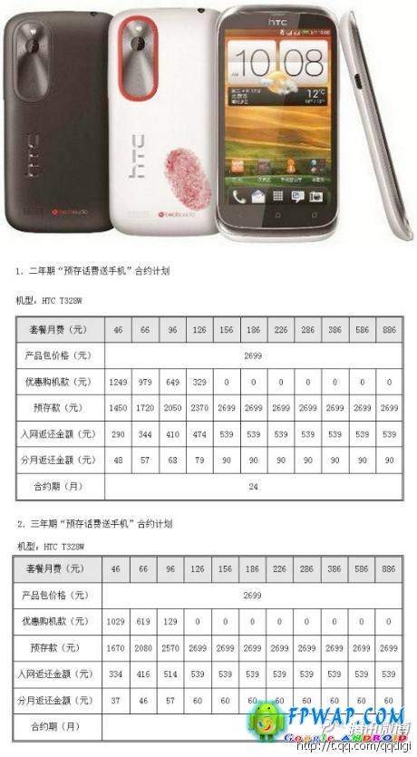 中国联通和HTC今天联合发布HTC desire V,售价1999元,也是HTC面向运营商发布最低价位手机。配备4.0英寸屏幕和1GHz处理器。支持双卡双待功能。该机将于4月23日上市,可选择156元套餐预存2699元签约两年,或者126元套餐预存2699元签约三年,即可0元购机。