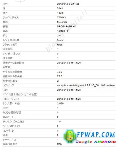 不知道哪一个 Motorola 的工程师把工程机拍摄的照片放上了网路相册 Picasa . 有人在 Picasa 上搜寻照片时发现了一批由一部名叫 Droid RAZR HD 的装置拍摄的照片 , 大家都知道 Droid RAZR 是 Motorola 的产品 , 加上 HD 之后 , 大家应该不约而同都会觉得是高清屏幕 , 以 Motorola 一贯慢三拍的习惯 , 估计也是 720p 屏幕 . 根据照片的 EXIF 资料显示 , Droid RAZR HD 拥有 f/2.4 光圈 , 而系统方面是 Android 4.0.3 . 我们等待 Droid RAZR HD 的机身照流出吧 .