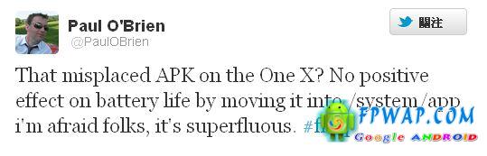 早前本网报导过 HTC One X 因为误放 Nvidia 的控电档而导致 HTC One X 多用了电 , 其后有网站提供了修正教学 . 不过事件似乎未有停止 . 著名科技网站 Modaco 创办人 Paul O’Brien 则在他的个人 Twitter 上表示修改这个 apk 的位置是一项多馀的动作 . 根本并无效果 .