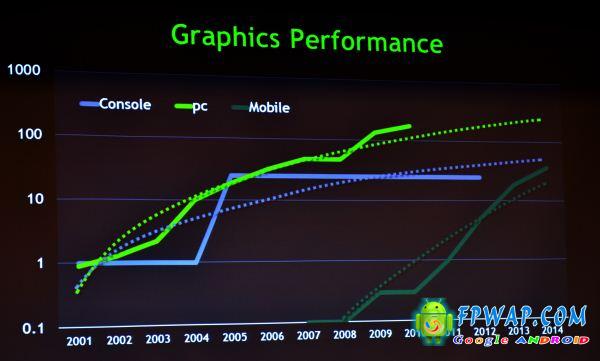 谁敢再说手机的图像处理能力低?Nvidia 近日展出了一张 GPU 效能对比图,图表显示出手机、游戏机(Xbox 360)及电脑 GPU 效能的走势。