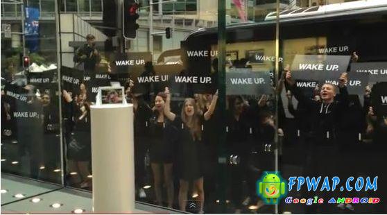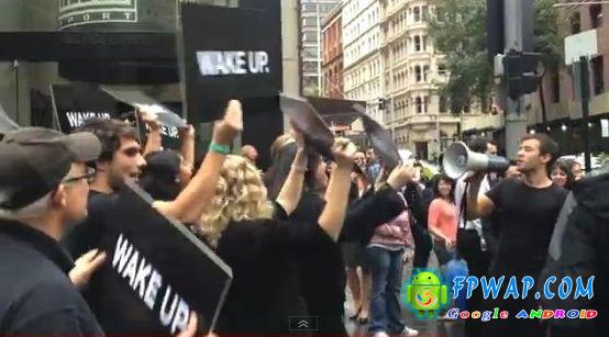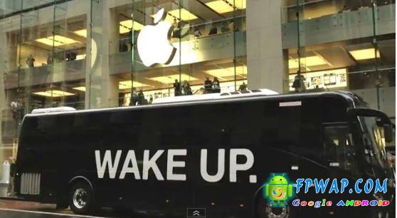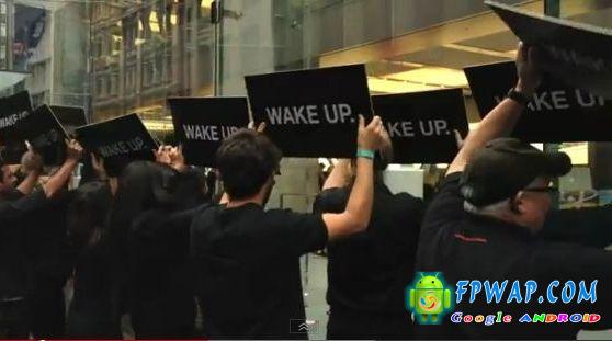 昨日 , 澳洲 Samsung 雇用了大量人员 , 驾著一辆黑色大巴停到 Apple store 门口 , 几十个全身黑色打扮的工作人员下车围著 Apple Store 大喊「Wake Up」(清醒) , 此行动的动机似乎有点不明 , 不过大概猜测为 Samsung 想唤醒 Apple 教徒 , 不要再沉迷了 .