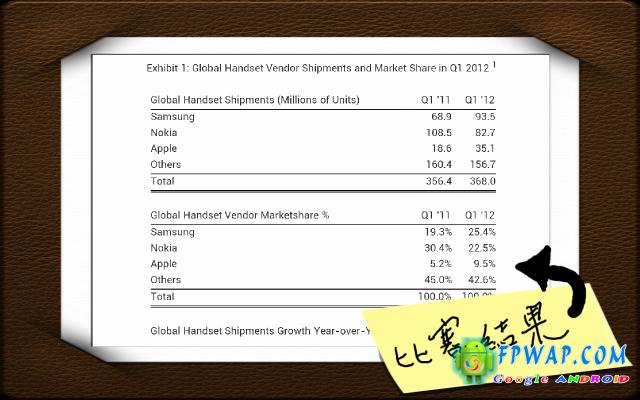 除手机出货量,Samsung 亦在市场佔有率中首次超越 Nokia,报告显示 Samsung 手机的市佔率在 2012 年第一季度一共佔有 25.4 个百分点,以 2.9 个百分点击倒 Nokia,Samsung 全面取代 Nokia,成爲新的手机界一个。(可喜可贺!)
