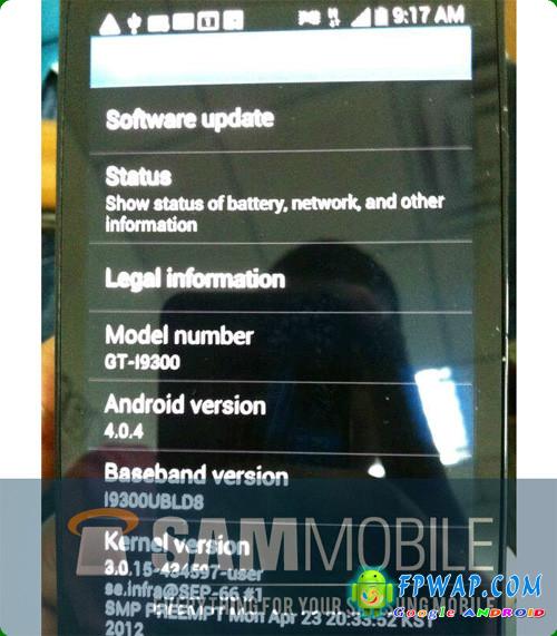 虽然 Samsung Galaxy S III 还有一天才发佈,但在前一天即是今天还有很多关于它的消息流出,继上篇流出的碟照后,今篇为大家介绍的消息是关于 Samsung Galaxy S III 的系统曝光,从照片可以看出此新机是运行 Android 4.0.4 最新的 ICS 系统,型号很明显是 GT – i9300,根据照片消息来看,该机所刷入的 ROM 是今年四月的版本,在 ROM 信息中的 I9300UBLD8,UB 代表巴西,L 表示 2012 年,而 D 表示为四月,最后 8 为 ROM 的版本。