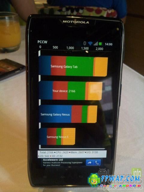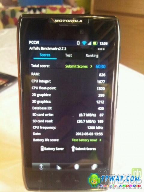 採用 TI OMAP 4430 双核处理器的 Motorola Razr Maxx 在 AnTuTu Benchmark 取得 6030 分,是少数出厂时能破过六千分的双核心手机。