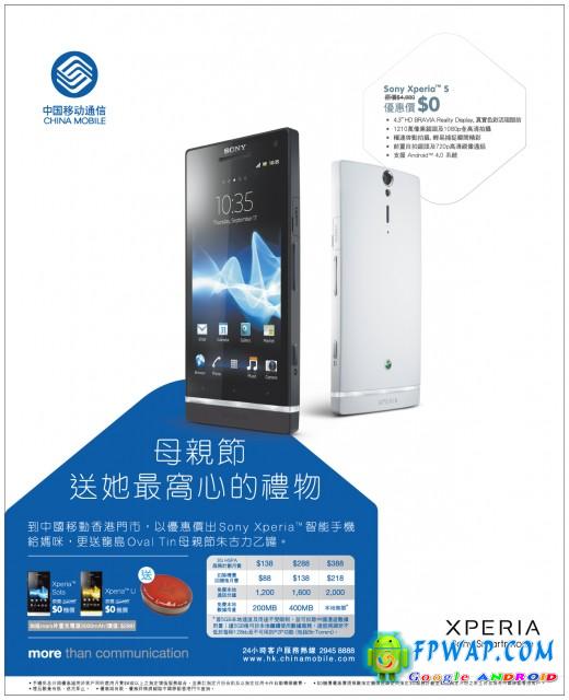中国移动香港有限公司宣佈推出母亲节手机优惠。由即日起,凡中国移动香港客户登记选用指定3G服务计划,即可以$0机价选购Sony XperiaTM S、Sony XperiaTM U及Sony XperiaTM Sola手机。