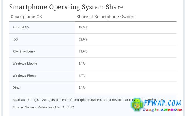 幸好数据不断推翻以上推测,近日再有报告指 Android 继续称霸美国手机界,用户比率更大幅抛离 iOS 16.5%,显示 Android 继续强势。据 Nielsen 最新报告,Android 系统在美国佔下 48.5% 市佔率,而 iOS 则被抛离至 32%,第三大系统就是长青系统 RIM 的 Blackberry,仍然佔有11.6%。