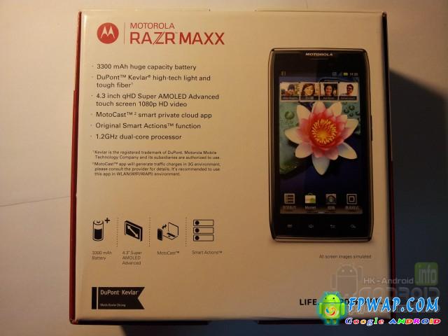 盒子背面印有手机简介,大家可以对 Razr Maxx 作初步认识。