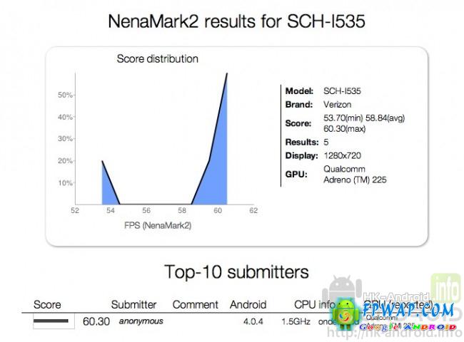 当 Galaxy S III 成为跑分王时,他的孖生弟弟也不甘视弱,有外国媒体报导,传言 Verizon 公司将会推出自家 4G LTE 网络的双核版本,NenaMark 已经接收到型号为 SCH-I535 的智能手机。从图中可以看出 Brand 为 Verizon,意即将由 Verizon 发佈,除此之外,CPU 採用了 1.5GHz高通 Snapdragon S4 双核处理器,相信各位读者对这个处理器的素质也不用置疑吧另外 GPU 搭载 1.5 GHz 的 Adreno 225 GPU,运行 Android 4.0.4。而在网站曝光的跑分图可以看出,在 NenaMark2 的测试平均成绩为 59.05 fps。有关更多双核版 Galaxy S III 三星官方还未正式向外公佈,有关详细规格,售价和发佈日期也有待三星的公佈,不过有消息人士称是次双核版 Galaxy S III 也许会在六月份发佈,希望各位读者会和小编一同等候吧。最后谢谢读者一路以来对小编和本网的支持。