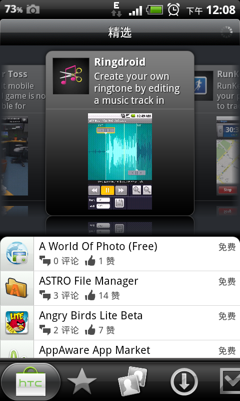 是一款以电子市场为基础的自带市场,上面可以看到htc推荐软件,以及你可以分享给你的朋友,你安装了什么软件,当然最后大多数软件的下载还是要自动转到电子市场(除去htc自己提供下载的widget)。