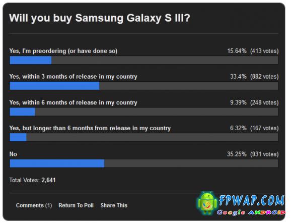 随著 Samsung Galaxy S III 正式发售的日子,大家都可能想了解这部旗舰级手机到底会有多受欢迎。近日有外国媒体进行了调查,但是结果颇令人意外 – 在总投票人数 2,641 人中,有高达 35.25% 表示不会购买 Galaxy S III。
