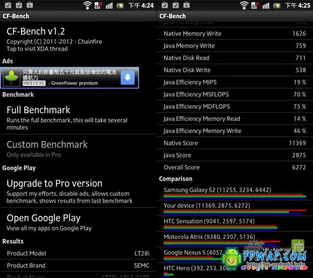 CF-Bench 是同时对不同的硬件情况进行测试 , 包括 内置 Memory 的读取 , Java 的运算力等 . 就整体而言 , Xperia ion 的表现似乎只在 GS2 的水平 .