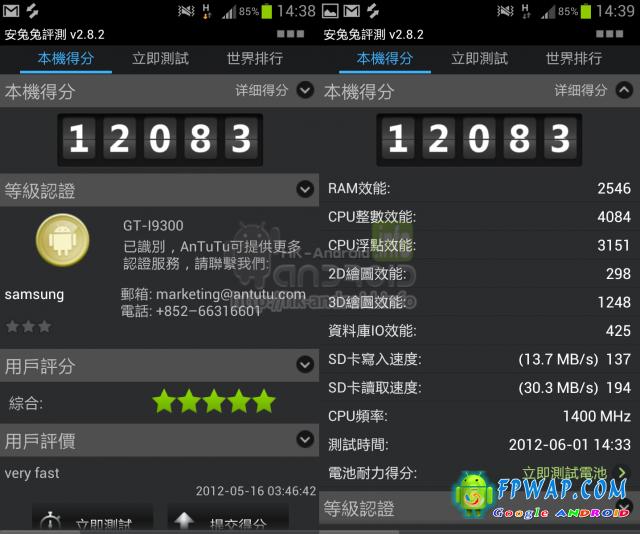 Galaxy S III 的处理器频率比对手的 1.5GHz 低,但受惠 32nm 製程,在 AnTuTu Benchmark 取得前所未见的 12083 高分。