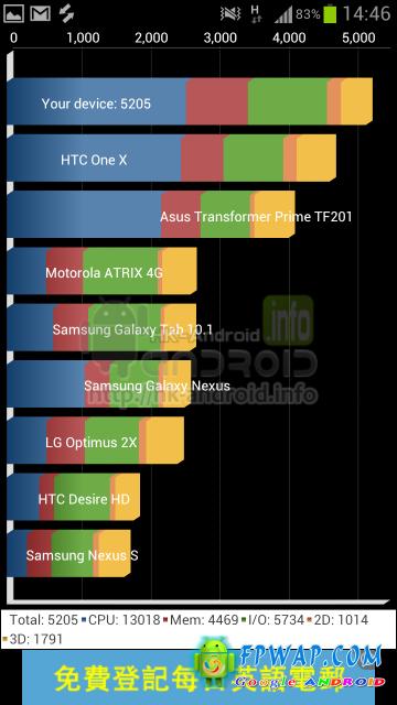 跑分仍是 Samsung 的老本行,Galaxy S III 在 Quadrant Benchmark 取得 5205 分。
