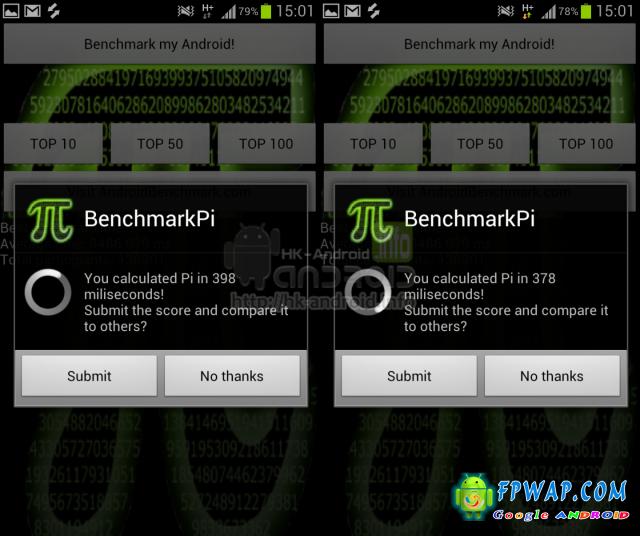 Galaxy S III 先后运行了两次 BenchmarkPi,分数都在 300 多ms,证实 Galaxy S III 的效能甚高!