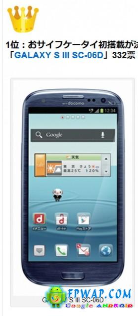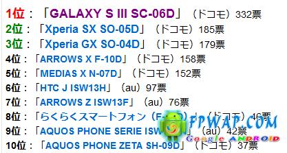 在 hatena 的统计中,拥有 2GB RAM、Qualcomm Snapdragon S4 处理器的 SD-06C (日版 Galaxy S III) 在总投票人数 1,578 票中夺得 332 票,比第二名的 Sony Xperia SX 多出 147 票 (因为 Xperia SX 分开 2 个电讯商版本并位列第 2、3 名,如果票数加在一起的话会是 384 票,比 Galaxy S III 多)。其他排名如下: