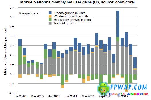 似乎答案可预见了 – 有调查报告指 Android 智能手机的销售增长开始放慢。Asymco 的 Horace Dediu 在对 comScore 最近公佈的数据进行分析后发现,Android 智能手机的新用户量在今年头 4 个月一直在下降。