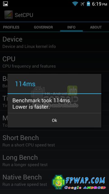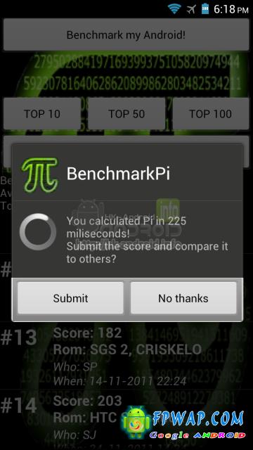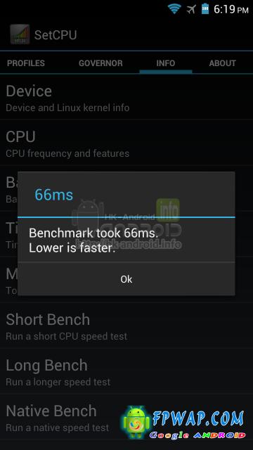 超频 1.8GHz 后的 HTC One XL 在 BenchmarkPi 取得异常的高分,只需 225ms 就能完成测试,比超频前的 302ms 快了不少。