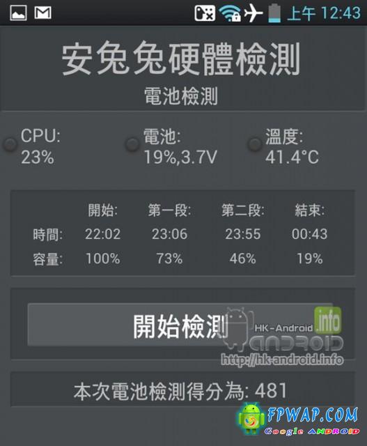LG 的 Optimus LTE II 其实比过往的 LG 机多电量 , 足足有 2150mAh , 主要是 Qualcomm Snapdragon S4 的 4G LTE 处理器较为耗电 , 从而加大电池的份量 . 不过他另一个优点是可以换电池 (见鬼的 , 这年代可以换电竟然是优点) . 我们照常使用安兔兔进行测试 , 发现 Optimus LTE II 的续航力非常不俗 . 安兔兔得分有 481 , 测试时间花了 161分钟用了81%电 , 如此推算 , 估计可以不停的使用达 3小时18分钟左右 , 续航力非常不错 .