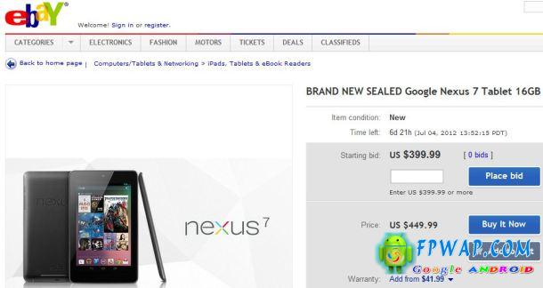 Google 昨天向大众发佈了 Google Nexus 7 平板电脑及搭载 Android Bean 系统,在七月正式发售。但外国便有人发现原来在 eBay 拍卖网站上已经发现了 Google Nexus 7 的踪影,但售价竟然是 $399.00 美元 16 GB 版本?根据消息指 Google I/O 2012 大会上有将近 6000名参与这个开发者会议,而且到埸人士将获派发 Google Nexus 7 ,Nexus Phone 和 Nexus Q,所以小编猜测在 eBay 上拍卖的 Google Nexus 7 有机会是从大会上得到。