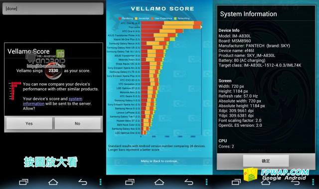 Vellamo 是一个专为浏览网页效能而开发的软件 , 针对大耗资源的 Java 及 HTML5 等做测试 . 分数方面比起现时最强的 HTC One X 只输了一点点 , 非常厉害 .