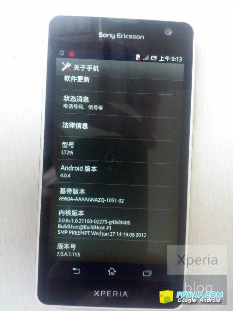 Sony LT29i 一推出的版本应该会是 Android 4.04 版本 , 也即是 ICS 最后的一个版本 , 未知未来是否有 果冻豆 可以吃 . 我们从版本号中所见是1.155 , 这明显还是测试中的 debug 版本.