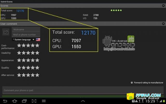 经过一轮跑分测试 , 我们见到的结果是可以「超班」来形容 , 分数绝对是现时高阶手机都未必比得上 . 由其是 安兔兔的测试中可以见到 , 12000 分 , 当今市场上只有三部 Android 移动装置可到达 , 一部是 魅族 MX 四核 , 另一部是 Samsung Galaxy S III , 最后一部就是现在的 Galaxy Note 10.1 . 三部机都有一个共通点 , 就是都是采用 SAMSUNG Exynos 4412, 1.4GHz 四核心处理器 . 所以归功于此 CPU 是没有错的了 . 不过有一点小编必须指出的 , 为什么没有 WiFi 版本 ??