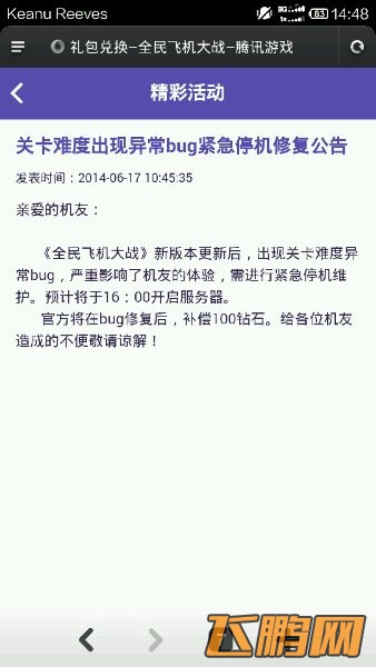 全民飞机大战停机修复期间小伙伴们是无法登录游戏的,因此大家只能等待。具体的开服时间应该是6月17日16:00左右,正式开启服务器后官方将会给所有玩家100钻石的补偿~
