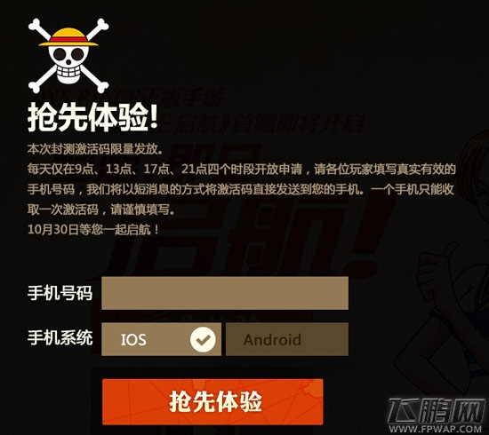 即日起,《航海王 启航》官网每日9点、13点、17点、21点四个时段开放“预注册”申请,加盟官网(网址:http://op.mobage.cn/home),填写真实手机号码,并选择相应手机系统,即可预定《航海王 启航》先锋测试激活码!